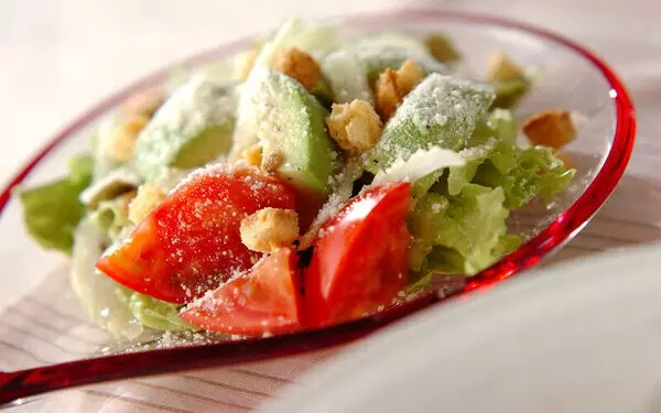 クリーミーなアボカドとフレッシュトマト、セロリの食感が楽しいサラダ。ドレッシングにはアンチョビやワインビネガーなどを使い、奥深い味わいに仕上げます。アンチョビに塩気があるので、塩こしょうは控えめでOK。しょうゆベースの生姜焼きとのコントラストを楽しみましょう。