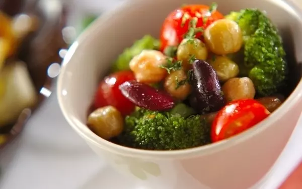 ホクホクのミックスビーンズを練りからし入りドレッシングで和える、和風サラダです。葉野菜のサラダのように水気が出にくいので、生姜焼きを作る前に準備しておいても良いですね。カラフルなサラダは、生姜焼きの献立を彩ってくれますよ。