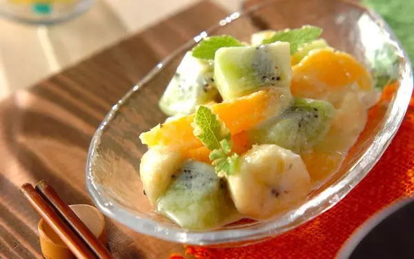 プレーンヨーグルトとフルーツで作るサラダは、デザート感覚で楽しめます。レシピではオレンジ、バナナ、キウイを使っていますが、イチゴやベリーなどでもアレンジできますよ。プレーンヨーグルトとフルーツの酸味で、生姜焼きのお口直しにぴったりです。