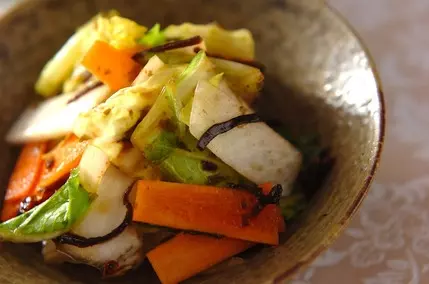 白菜やニンニンなどざく切りにした野菜と塩昆布をビニール袋に入れてよくもみ、15~20分位冷蔵庫で冷やすだけ。箸休めにピッタリ!冷蔵庫の残り野菜をいろいろ入れて味わってください。