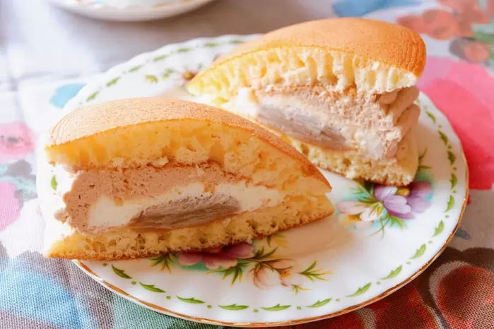 半分に割って食べることにしました。どら焼きの皮というより、パンケーキに近いふわふわ感です!どら焼きの皮はしっとりとした甘い味わいが一般的のように思うのですが、こちらは皮には甘さはあまりなく、しっかりモンブランのクリームを味わうために作られているように思いました。中は栗と白あんのペースト状のものが入っていて、こちらがとっても甘い!全体的にバランスが良いので、重たさはなく、パクパク食べられます!気が付いたら半分なくなってました…!