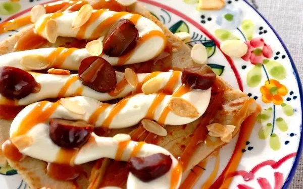 栗の渋皮煮とマスカルポーネをトッピングするデザート系ガレットです。メレンゲと合わせてふわふわになったマスカルポーネクリームに、ほっくり甘い栗がよく合います。表面に散らばった栗を生地で包みながら召し上がれ!