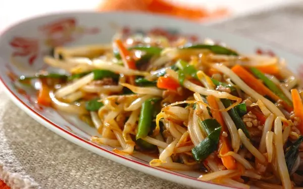 豚ひき肉をみそや豆板醤で味付けした肉みそは、野菜と組み合わせると絶品です。肉みそにサッと火を通した太モヤシとニンジンなどを合わせ、オイスターソースやしょうゆなどで味を調えます。複数の調味料のコクや風味が豊かな一皿。そのままはもちろん、麺やごはんにのせて豪快にいただくのも良いですね。