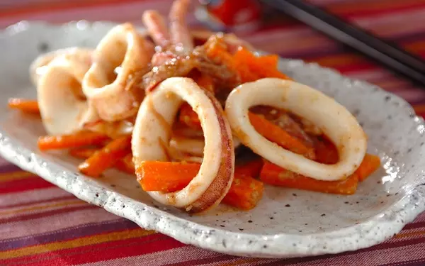 砂糖を多めに使い、甘口に仕上げるみそ炒めです。イカは硬くなりやすいので、ニンジンに火が通ってから加えると良いですよ。イカの色が変わったら合わせみそを加えてサッと全体にからめましょう。