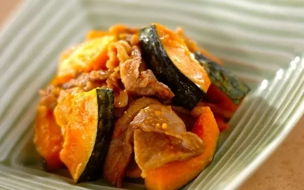 みそとショウガ、砂糖などで味付けした炒めものは大人にも子どもにも好まれる一品です。カボチャはレンジで加熱してから炒めるため、短時間で仕上がるのが魅力。豚肉はこま切れを使っていますが、バラやロース肉でもOKです。