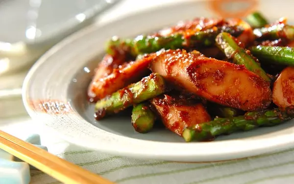 おやつやおつまみに人気の魚肉ソーセージを、ひと手間加えて副菜にアレンジ。魚肉ソーセージとグリーンアスパラを炒めたら、みそとバターで味付けします。みそが固いときは少量のみりんで伸ばすとなじみやすいですよ。