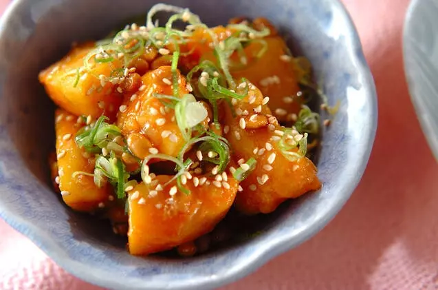 コチュジャン入りの納豆ダレがジャガイモにしっかり絡んで美味。ビールやレモンサワー、ハイボールなどに合う簡単レシピは卵黄入りでまろやかです。
