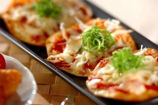 餃子の皮で作るピザです。シラスと大葉、パスタ用のトマトソースにチーズたっぷりかけて!子どもも大好きな味ですね。材料を餃子の皮にのせたらのせたらトースターで焼くだけなので、親子で一緒にぜひ!