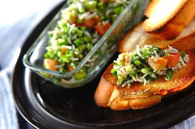 たっぷりのネギとニンニクの香りがたまらないブルスケッタ。熱々のうちにバゲットにたっぷりのせて召し上がってください。シラスに塩分があるので、物足りなければ食べる時に上から塩を振りましょう。