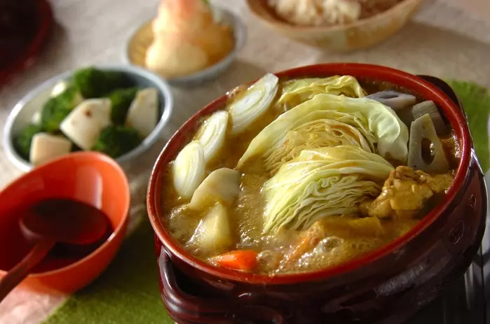 冬に出番が多い鍋。ダイナミックに切ったキャベツと鶏肉をカレー豆乳味で食べます。〆はリゾットにしてチーズをかけるととろける美味しさになりますよ。