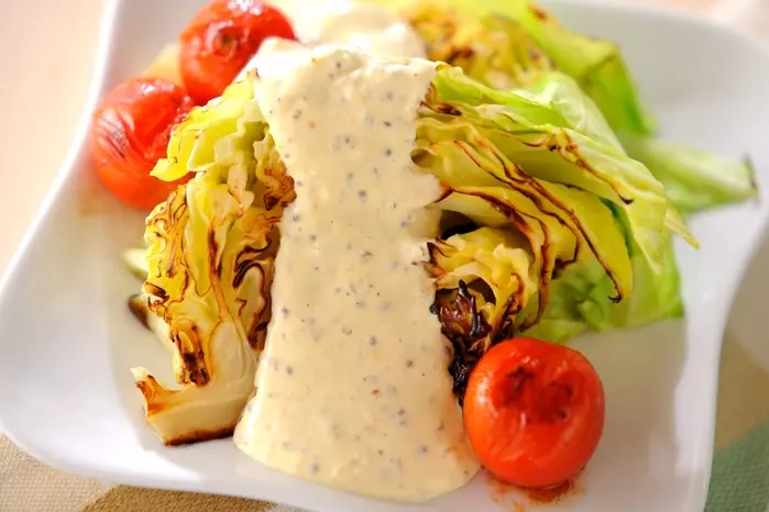 じっくり火を通したキャベツの甘さは格別の美味しさです。しっかりと焼き目をつけて香ばしさも一緒に味わってください。マヨネーズベースの酸味が効いたソースが甘みをさらに引き出します。