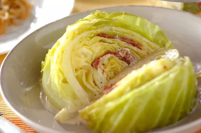 キャベツの葉の間にコンビーフをサンドしてミルクで煮た優しい味の一品です。コンビーフから旨味が出るので味付けはシンプルでOKです。