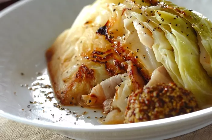 冷蔵庫にあるのはキャベツだけ…なんていうときにはザクッと1/4サイズそのままをダイナミックに使えば見栄えもボリュームも満点のおかずが完成します。
