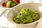 茹でたホウレン草をミキサーに。エビの代わりにベーコンを炒めて、ホウレン草のソースを入れたらコク旨に仕上がります。クリーミーなホウレン草ソースにベーコンの塩気がアクセントに。