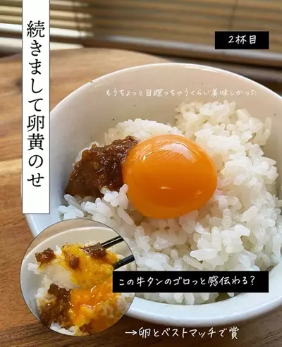 「もう新米が止まらないのです。少しゴロっとした牛たんの感じもかなり良き。これはリピートして買いたいアイテム!」と絶賛しています。