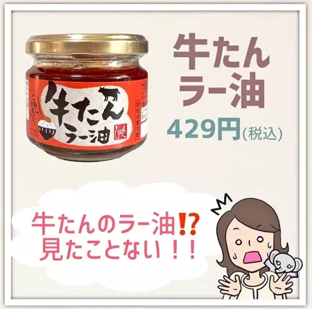 ●牛たんラー油ごはんにのせるだけでなく、料理のたれや調味料として使ってもおいしいごはんのお供たちもたくさんあります。なかでも、ピリ辛系の味がお好きな人にはこちらの「牛タンラー油」(税込429円)がおすすめ、というのは前出のみぃさん。