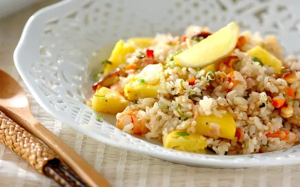 4人分でパイナップルを1個使う、フルーティーなチャーハン。甘酸っぱさにナンプラーの香りが好相性で、一気にエスニック感が高まります。カシューナッツのカリッと食感がアクセントになり、いつもと違うチャーハンを食べたい方にぴったりです。