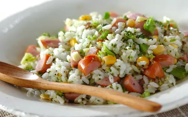 ソーセージと水煮コーンをたっぷり入れるので、ブロッコリーが苦手な子どもも食べやすいチャーハンに。カラフルな見た目で食欲をそそられますよ。レシピでは粗びき黒コショウを振っていますが、子ども用は省いてもOK。冷めても味が落ちないので、お弁当にも最適です。
