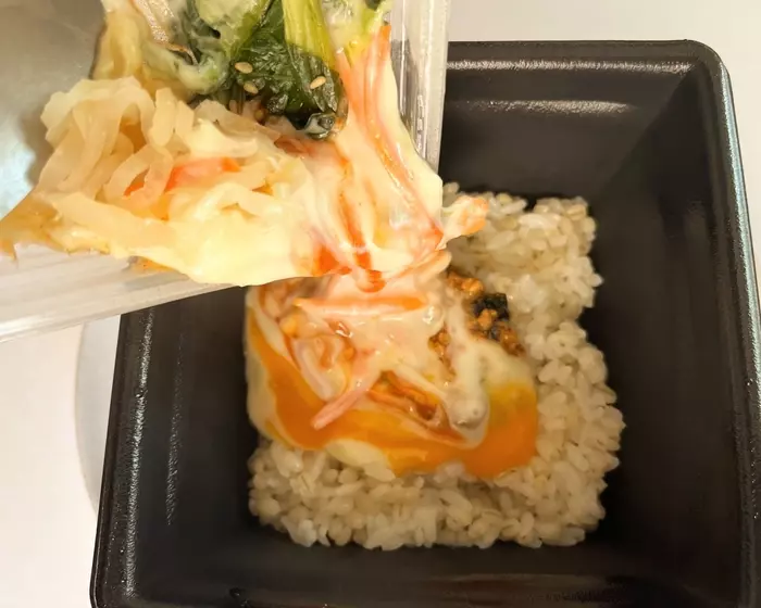 野菜や豚ひき肉、キムチなどの具材が入った、とろーりチーズと卵黄ソースでお味濃厚で満足感たっぷりビビンバ。混ぜ合わせる瞬間がワクワク、もち麦の食感とシャキシャキした野菜の食感もやみつきに!