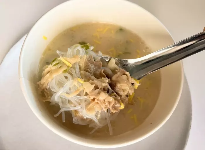 牛白湯スープの深い味わい。お肉と春雨がたっぷり入ってで嬉しい180kcal。一品でおかずにも軽食にも。ピリリと効いた胡椒が◎