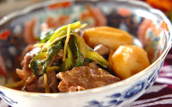 しょうゆ味が多い里芋の煮物をみそ味でアレンジ。里芋はレンジ加熱してから煮るため、時短になりますよ。加熱後に水洗いすると、ぬめりが取れて鍋で茹でたのと同じような効果に。旨みの強い牛肉ややわらかな九条ネギと一緒に食べれば、晩秋〜冬の味覚を存分に堪能できます。