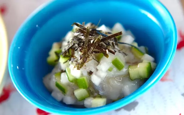 塩クラゲのコリコリとした食感をお楽しみあれ! 合わせ酢のボウルに塩クラゲ、キュウリを加えて和えるだけで作れます。あと1品ほしいときや、急ぎでおつまみを用意したいときに最適です。酸味と甘みのバランス抜群で、何度も作りたくなりますよ。