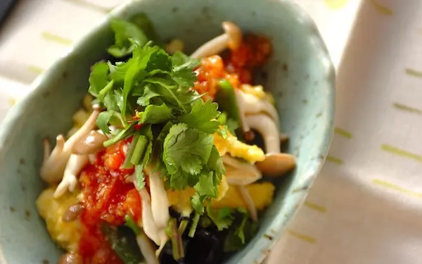 ふわふわの卵とコリコリしたキクラゲが美味しいハーモニーを奏でてくれますよ。スイートチリソースを加えて、エスニック風に簡単アレンジ。パンと一緒に食べるのもおすすめです。仕上げにパクチーを添えると、より南国感が出ます。