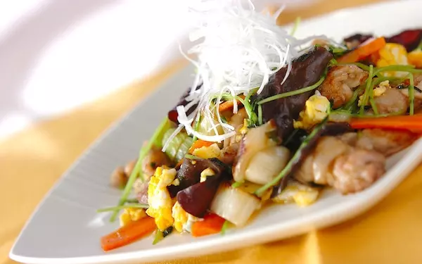 料理の主役になることが少ないキクラゲを存分に満喫できる一品です。豆苗、ニンジン、白ネギ、ショウガ、薄切り豚肉と一緒に炒めます。キクラゲをたっぷり入れることで、存在感がアップ。最後にふわふわ卵を加えれば、食べ応えのある、具だくさんなおかずになりますよ。