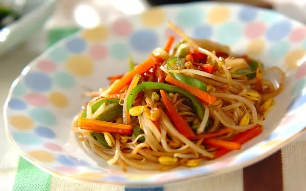コリコリとした豆モヤシを使うヘルシーな一皿。豆モヤシをニンジン、ピーマンと炒め合わせます。シンプルな料理ですが、調味料のウスターソースのコクが全体に行き渡り、くせになる味です。低カロリーなので、ダイエット中でも罪悪感なく食べられますよ。