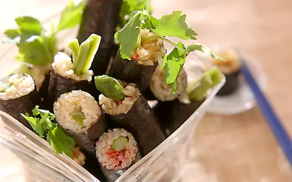 3種類のコリコリクラゲの中華巻き。細く巻くため食べやすいのが魅力です。ごはんの黒酢が中華風によく合います。梅クラゲとグリーンアスパラなどを巻くため、どれも彩り鮮やか。おもてなしに喜ばれそうですね。パーティーの持ち寄りにもどうぞ。