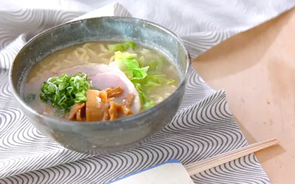 ラーメンスープを手作りすると、味が決まらないことがありませんか? そんなときは鶏ガラスープの素と麺つゆのコンビが活躍しますよ。豚バラ肉の旨みがスープにしみ出て風味アップ。味がピタッと決まります。トッピングの野菜はレンジで簡単に仕上げましょう。