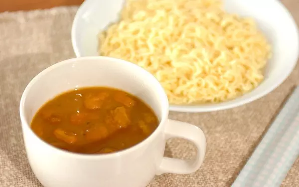 忙しいときは短時間で作れるラーメンがもってこい。こちらは、カップラーメンとインスタントのポタージュスープを使うアイデアレシピです。カップラーメンができあがる間に、つけ麺のスープを作れるため、10分以内で完成。ポタージュスープにインスタントコーヒーを混ぜることで、甘くなりすぎずラーメンに合いますよ。意外な組み合わせをぜひ試してみてください。