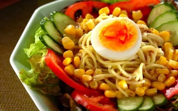 変わり種のラーメンといえば、ラーメンサラダを思い浮かべる方も多いかもしれませんね。ラーメンを茹でたら流水でしめて、水気を切っておくと味がぼやけません。味付けはゴマドレッシングとマヨネーズなので失敗がないのもうれしいポイント。ラーメンが少しだけ余ったときにもおすすめです。