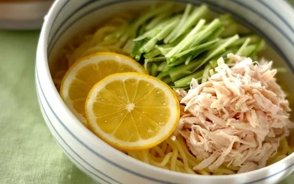 2人分でレモン1個分の果汁を使う、爽やかなラーメンです。酸味を効かせているので、食欲がないときでも食べやすいのが魅力。スープは氷を入れて冷やしておきましょう。鶏ささ身の代わりに、ツナの水煮缶でも◎です。