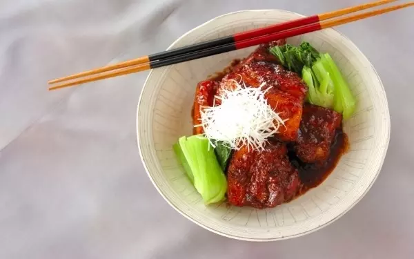 八角がほんのり香る、中華風豚の角煮です。黒糖の甘さとコクが味の決め手に。ただ甘辛いだけでなく、やみつきになる美味しさです。こってりとした照りに食欲をそそられますね。
