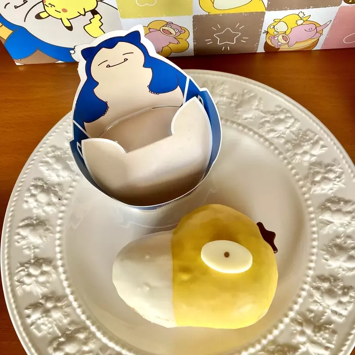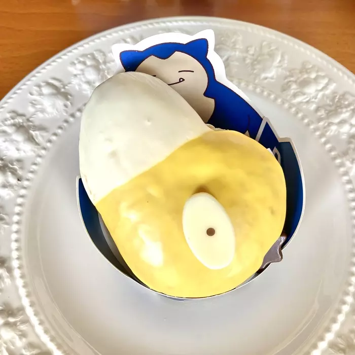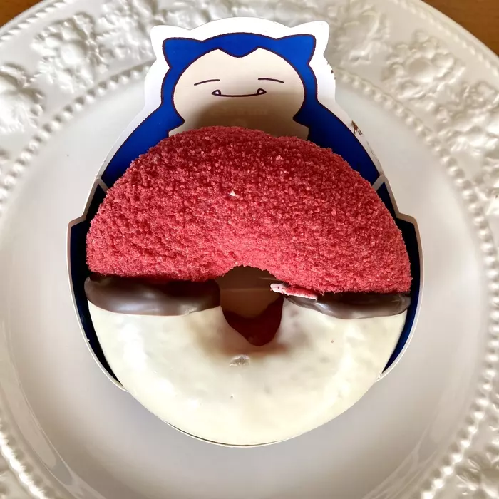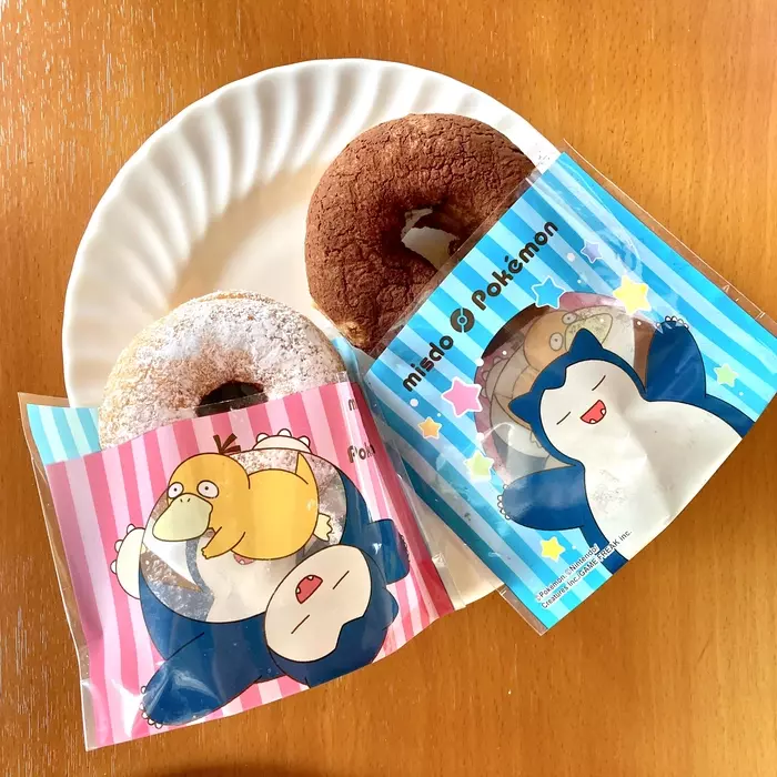 こちらは、カビゴンのイラストが描かれたスリーブに入った2種類のドーナツ。筆者は、2種類のスリーブに入っているんだと思っていましたが、実際に手に取ってみると、どちらも同じスリーブで、青い色が表なのがチョコ&ホイップ、ピンクが表なのがカスタード&ホイップでした。