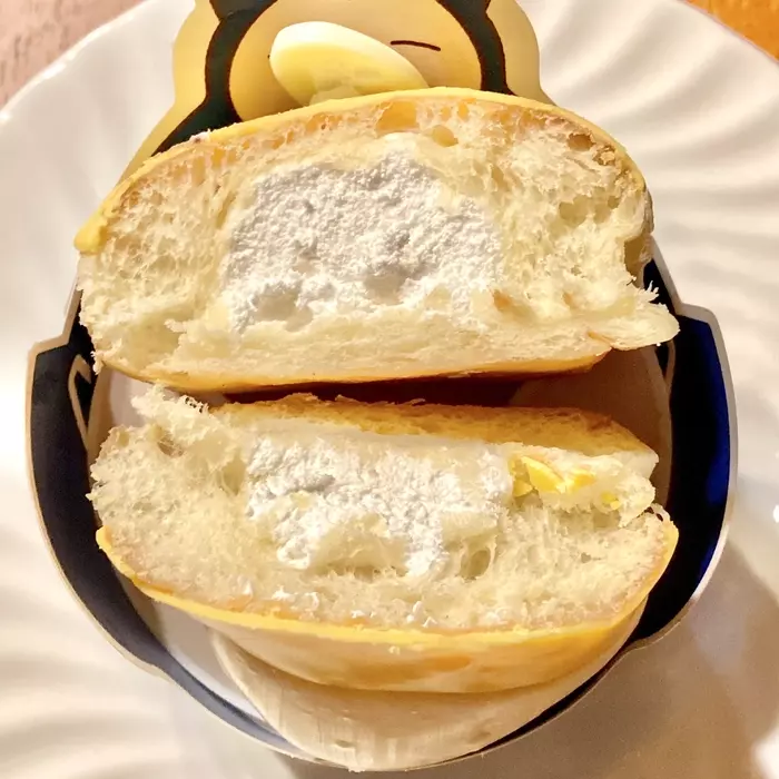 半分に割ると中には、ホイップクリームが入っていました。写真ではわかりにくいのですが、コダックの白いくちばしあたりから先にはクリームは入っていませんでした。ピカチュウの耳と同じですね。クリーム好きの子どもは、嬉々として食べていましたよ。