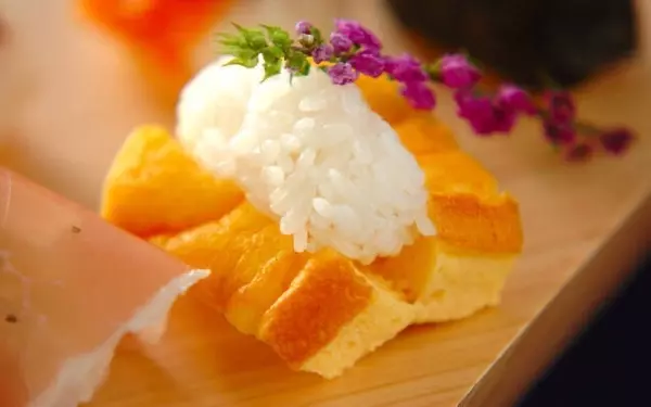 ハンペンを加えたふわふわの厚焼き卵に、酢飯をのせてにぎり寿司にします。材料をフードプロセッサーで混ぜ、オーブンで焼くので、意外と簡単です。キレイに盛り付けると、まるでお寿司屋さんのような仕上がりになりますよ。