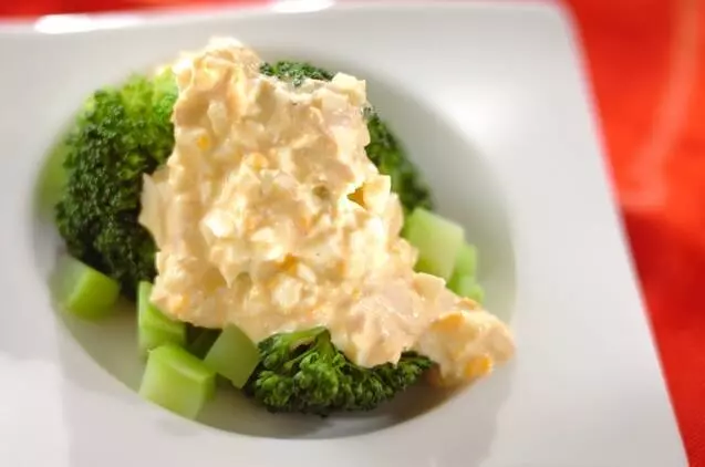 茹で卵をつぶしてマヨネーズと和えたソースをブロッコリーにトッピングしました。ブロッコリーの茎も人口大に切り一緒に食べると栄養価もアップしフードロスにもつながります。