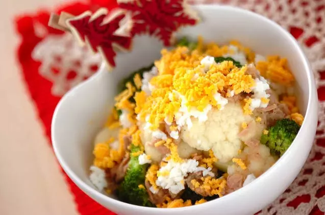 茹で卵の黄身をこしてミモザ風に仕上げた見た目がかわいいサラダです。おもてなしにも喜ばれそうですね。