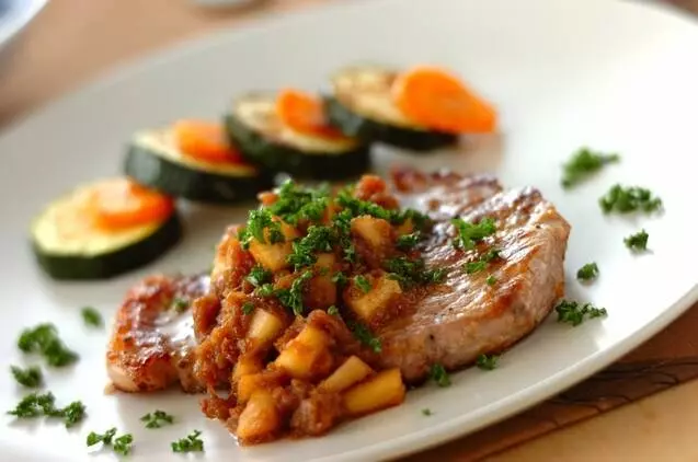 スイーツやサラダだけでなく、リンゴはおかずとしても大活躍!今回は厚切りポークステーキに、リンゴと甘みとショウガの爽やかさが効いたソースが良く合います。