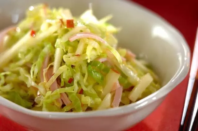 リンゴの甘酸っぱさとハムの塩気をいかしたさっぱりテイストのサラダはシャキシャキの食感で美味。そのまま食べたりロールパンに挟んだりアレンジが効くサラダです。