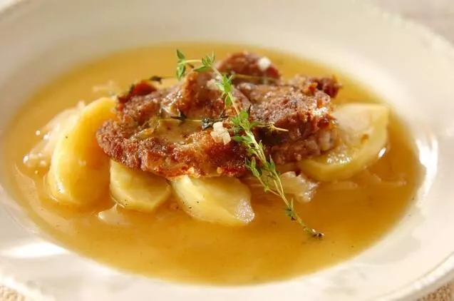 豚のロース肉とリンゴをじっくり蒸し焼きにしたおしゃれな一品。じっくりと煮込んだリンゴは万能ソースになります。水分が少なくなったら焦げ付かないように水を少量加えてください。