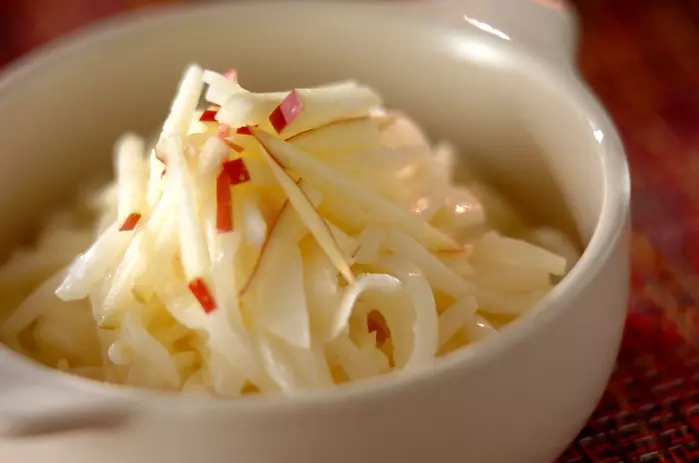 千切りにした大根とリンゴで作るサラダは栄養価が高いので風邪予防にも。さっぱりテイストなので肉料理や煮込み料理の副菜にオススメです。