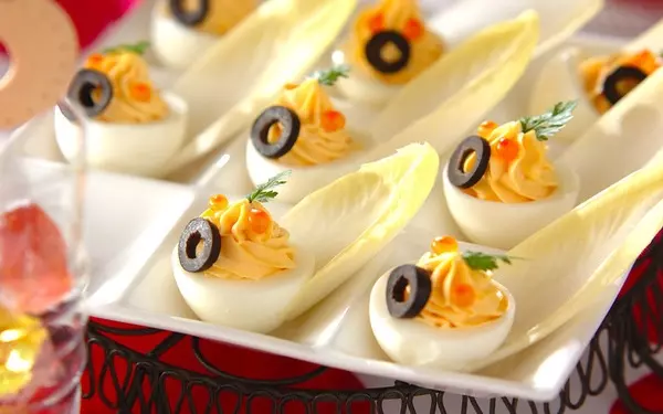 ほのかな苦みが特徴のチコリを器代わりにする、おしゃれなオードブルは簡単ながら見栄えが良いのが魅力。ゆで卵の黄身にカッテージチーズやマヨネーズなどを混ぜ、ホイップクリームのように絞ります。チコリは生のまま食べられるので、一緒に召し上がれ。