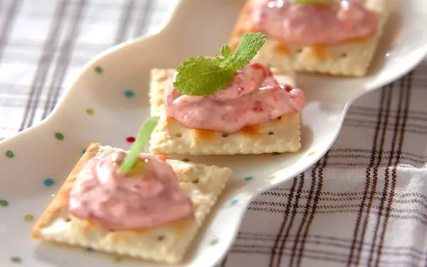 クラッカーにトッピングするカナッペは、手軽に作れるオードブルとして人気。こちらはサワークリームにジャムを混ぜて爽やかに仕上げます。大人にも子どもにもおすすめ。サワークリームにスモークサーモンや生ハムをトッピングしたり、ツナマヨネーズを使ったりと、数種類のカナッペを用意するのも良いですね。
