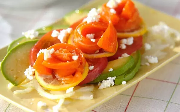 お刺身用のサーモンを使うカルパッチョ。サーモンを薄切りにし、くるくる巻いて盛り付けるとバラの花のような豪華な見た目になりますよ。脂ののったサーモンとトマトのみずみずしさ、カッテージチーズのコクなどが合わさり、大満足できます。
