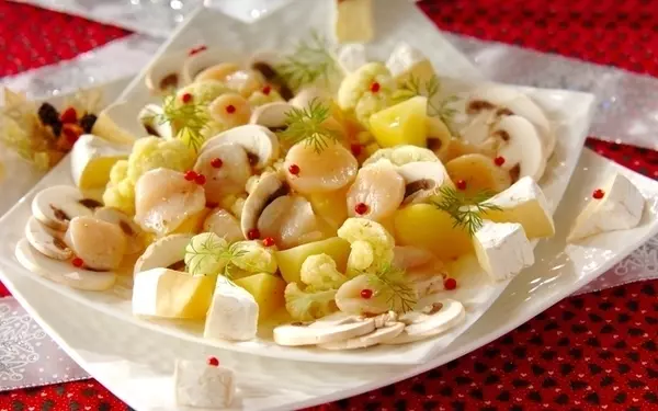 ホタテ・カリフラワー・カマンベールなどを使う、クリスマス向けのサラダです。カリフラワーとジャガイモはレンジ加熱するため、鍋不要。洗い物が少なく済むのは助かりますね。ハニーレモンドレッシングは甘酸っぱく、ワインのおともにぴったりです。