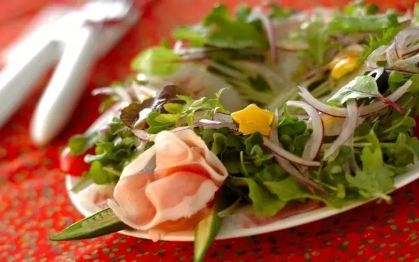 クリスマスのメインは肉料理になることが多いため、さっぱりしたサラダがあると献立にメリハリがつきますよ。こちらは、ベビーリーフやパプリカなどに、鯛や生ハムなどを組み合わせたサラダ。全体をさっくり混ぜたら丸くなるように盛り付けて召しあがれ。