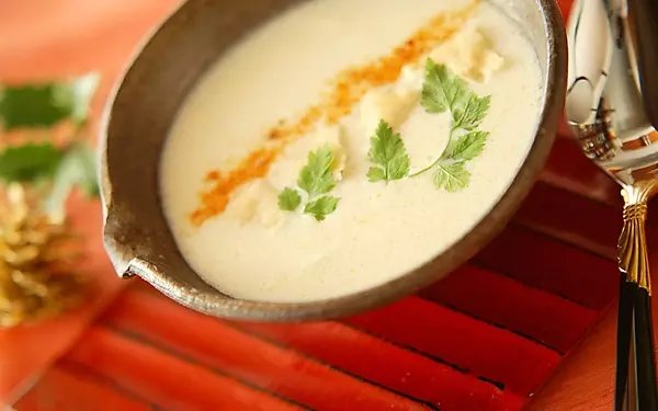 カリフラワーやジャガイモなどで作った、ミルキーなスープです。野菜の甘みが際立ち、大人にも子どもにも好まれますよ。野菜に火が通ったら牛乳を加え、ミキサーでなめらかに。生クリームを入れたら沸騰させないように温めると、口当たりよく仕上がります。
